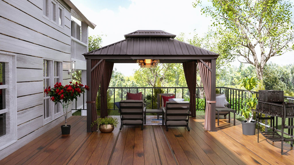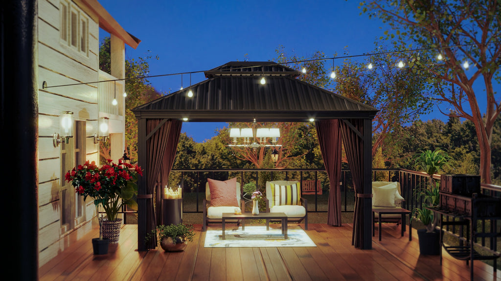 Happatio now offers a variety of outdoor patio furniture, including a 10' x 12' hardtop gazebo with a double polycarbonate roof. This type of double-layered hardtop allows for air circulation, increasing the stability of the gazebo. The panels are also fade-resistant, allowing for longer-lasting outdoor entertainment. The outdoor gazebo is also equipped with a dual-track system, allowing for the independent sliding of mosquito nets and curtains. The removable curtains ensure UV and rain protection, while the mesh mosquito net with zippers provides good ventilation, allowing you to enjoy privacy while still having ample airflow and a wide outdoor view.