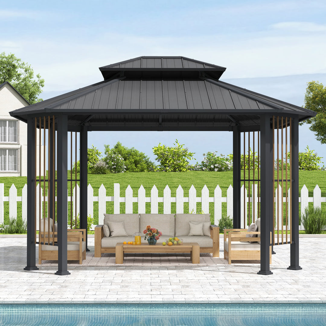 HAPPATIO 11' x 13 Outdoor Octagon Gazebo, Outdoor Pavilion Hardtop Gazebo with Double Tiered Ventilated Roof, Dual Rails and Ceiling Hook for Patio, Garden, Backyard Shade