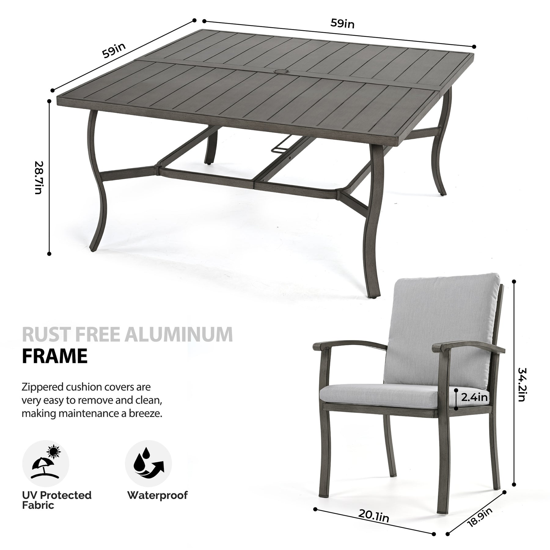 Removable Waterproof Cushions: Each dining chair is equipped with thick, comfortable cushions that feature a zippered design for easy removal. Made of waterproof and UV-resistant fabric, the cushions resist fading and stains, keeping them clean for outdoor use. Simply unzip the cover for hand washing or spot cleaning, hassle-free maintenance.