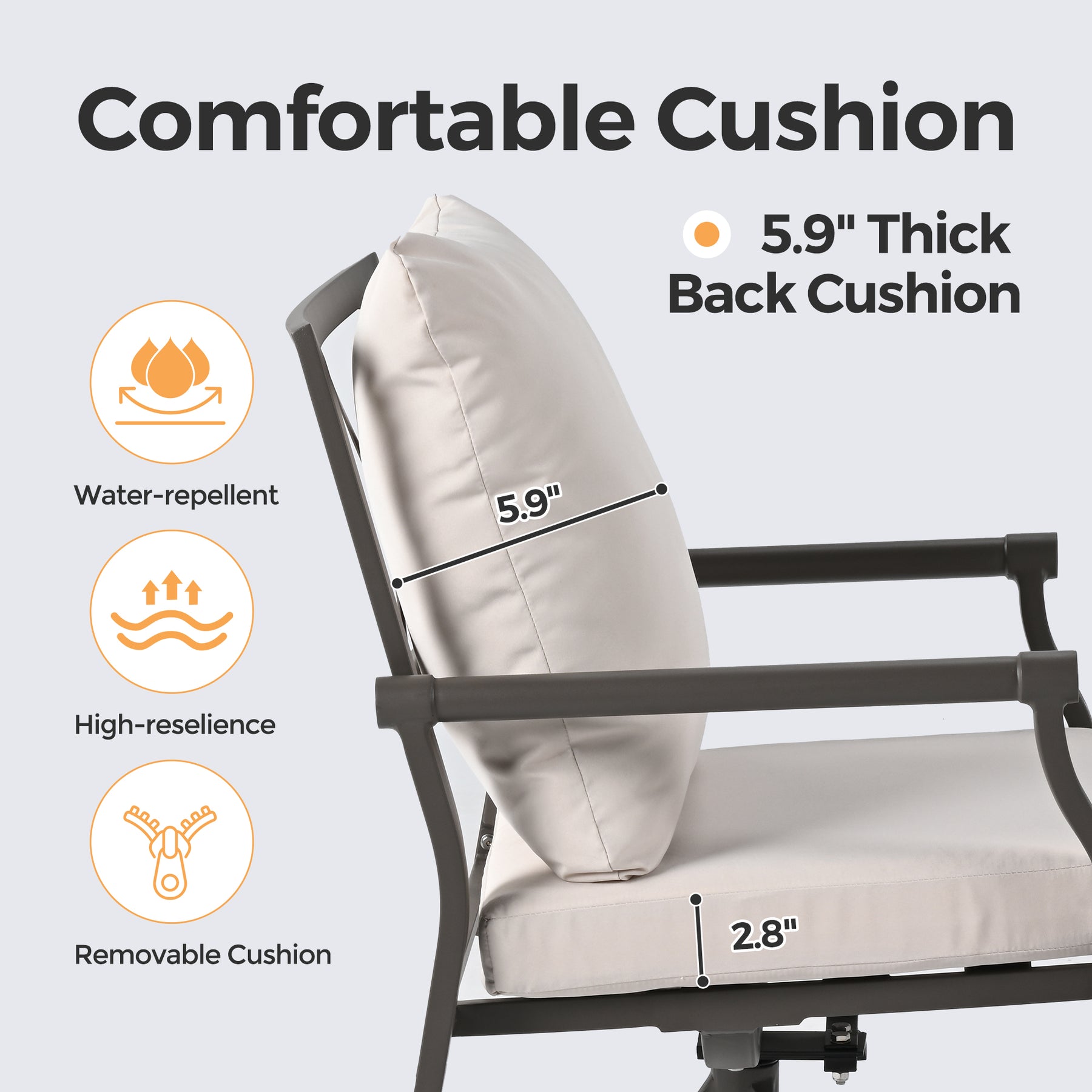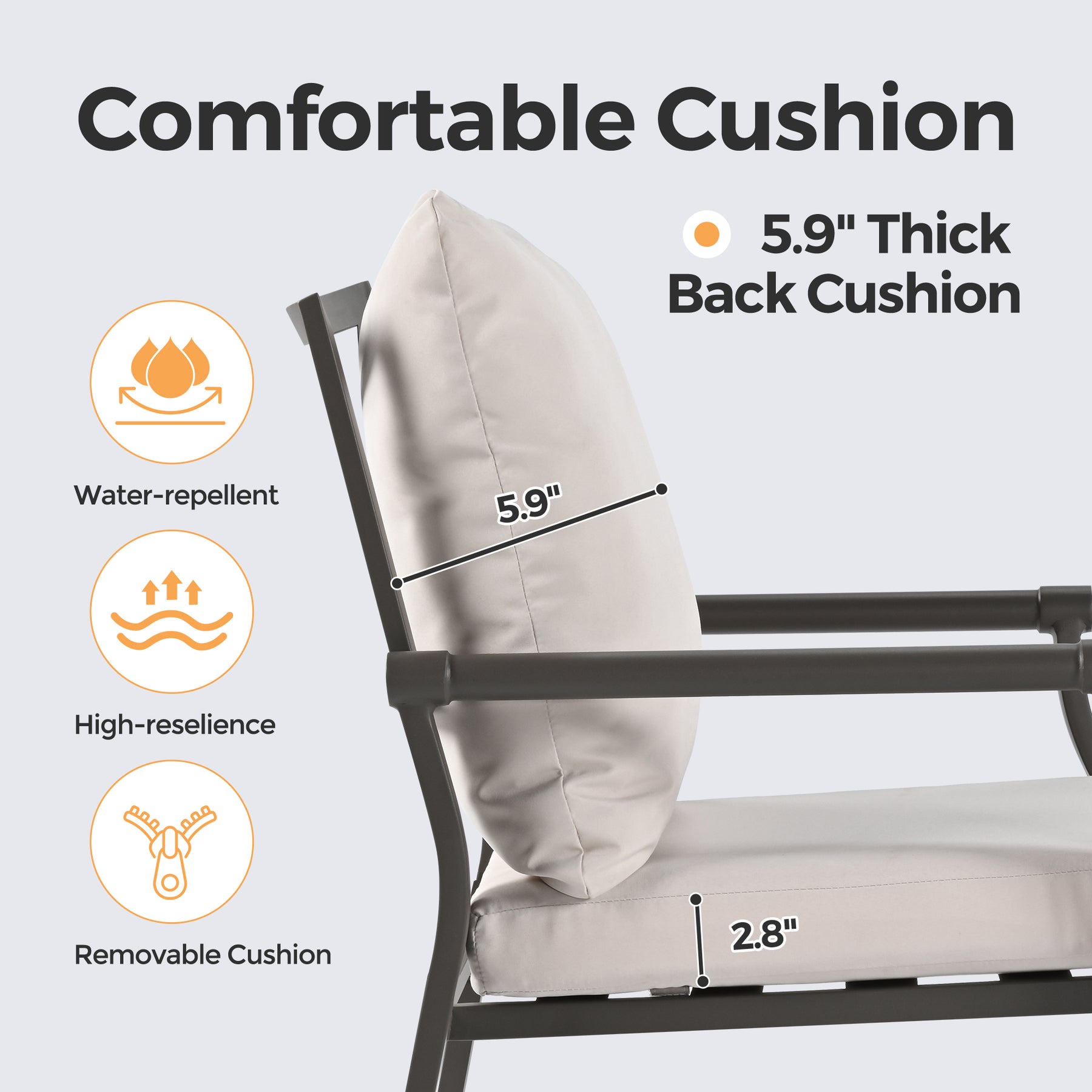Elevated Comfort Cushion: This chair features thick back and seat cushions wrapped in premium polyester fabric with moisture-resistant cores. The seat cushions attach securely with velcro, allowing for easy removal and effortless maintenance.