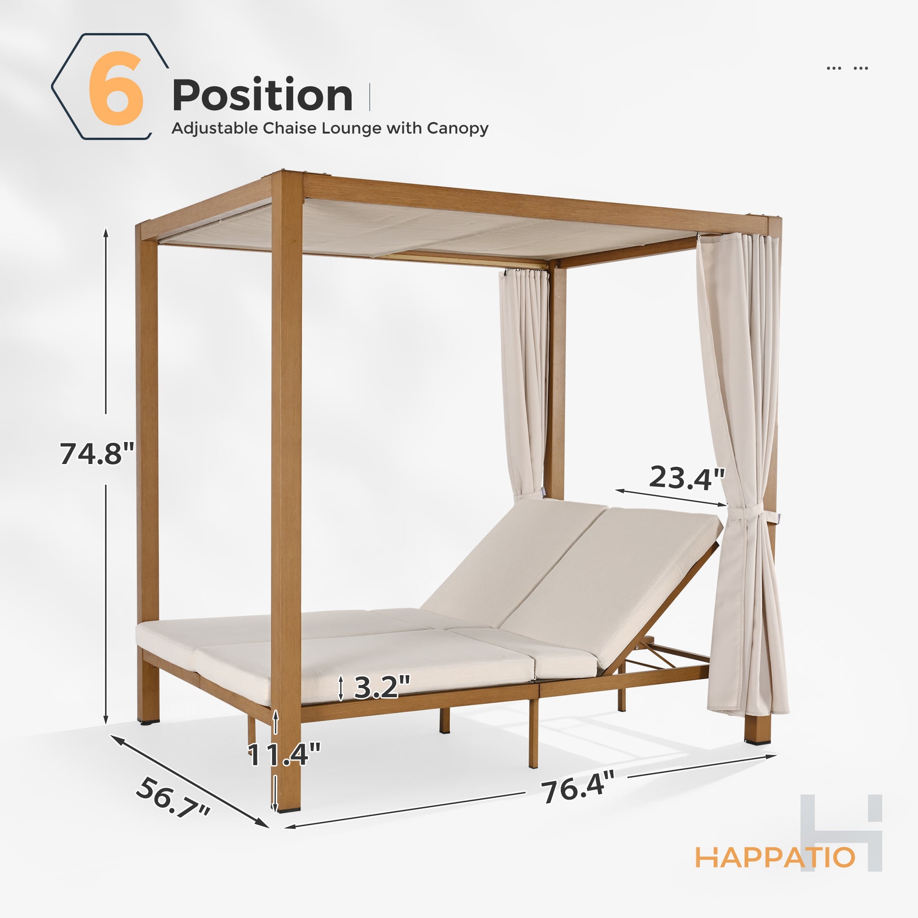 HAPPATIO Outdoor Patio Daybed with Retractable Canopy Bed,Patio Chaise Lounge with Adjustable Backrest, Wood-Like Aluminum Frame with Cushion & Curtain, Outdoor Chaise for Outside Pool, Garden