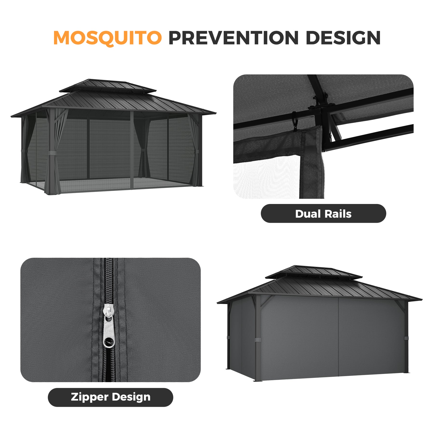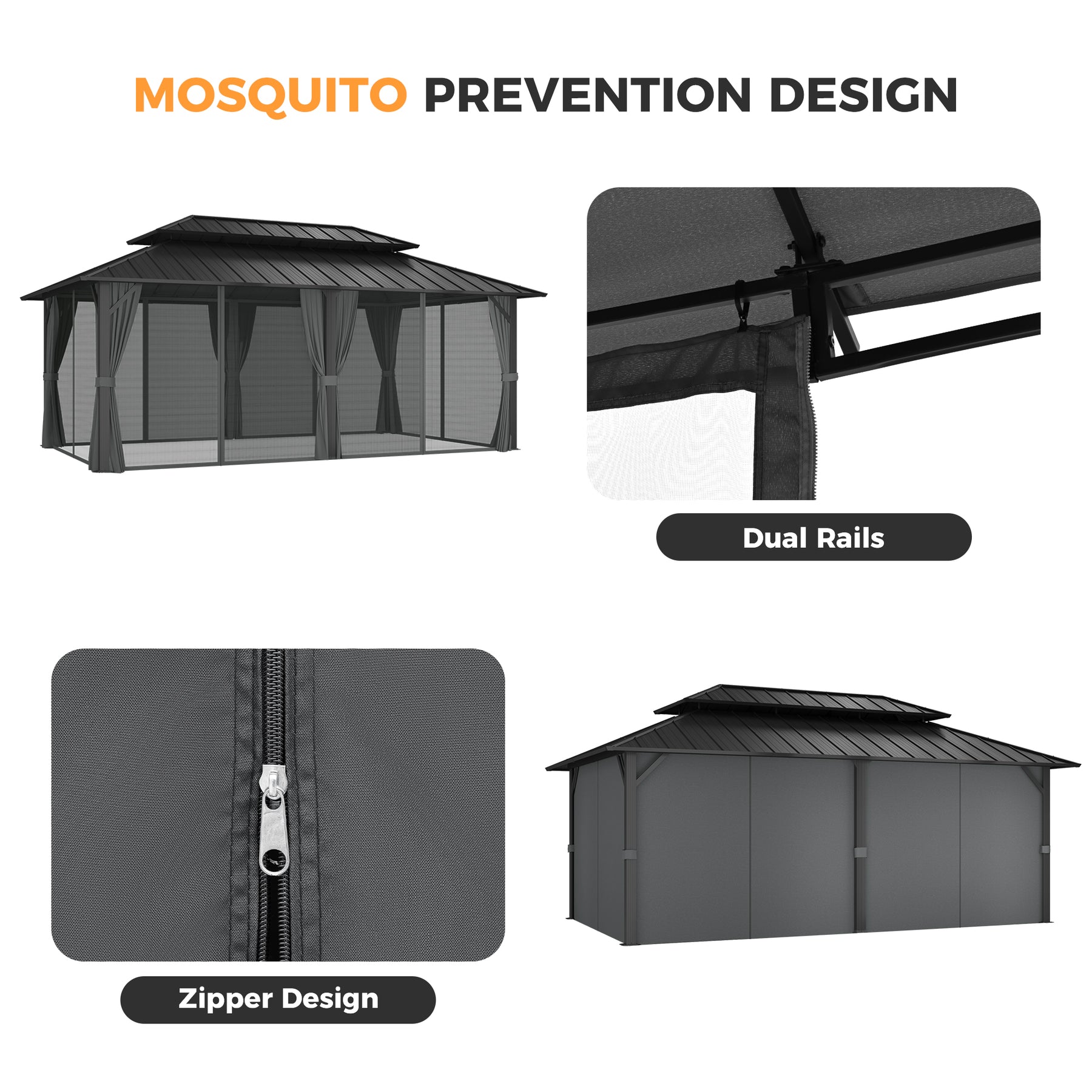 Versatile Netting & Curtains with Dual Rails Equipped with a dual rail system for effortless switching between removable mesh netting and privacy curtains. This offers flexible enclosure options.