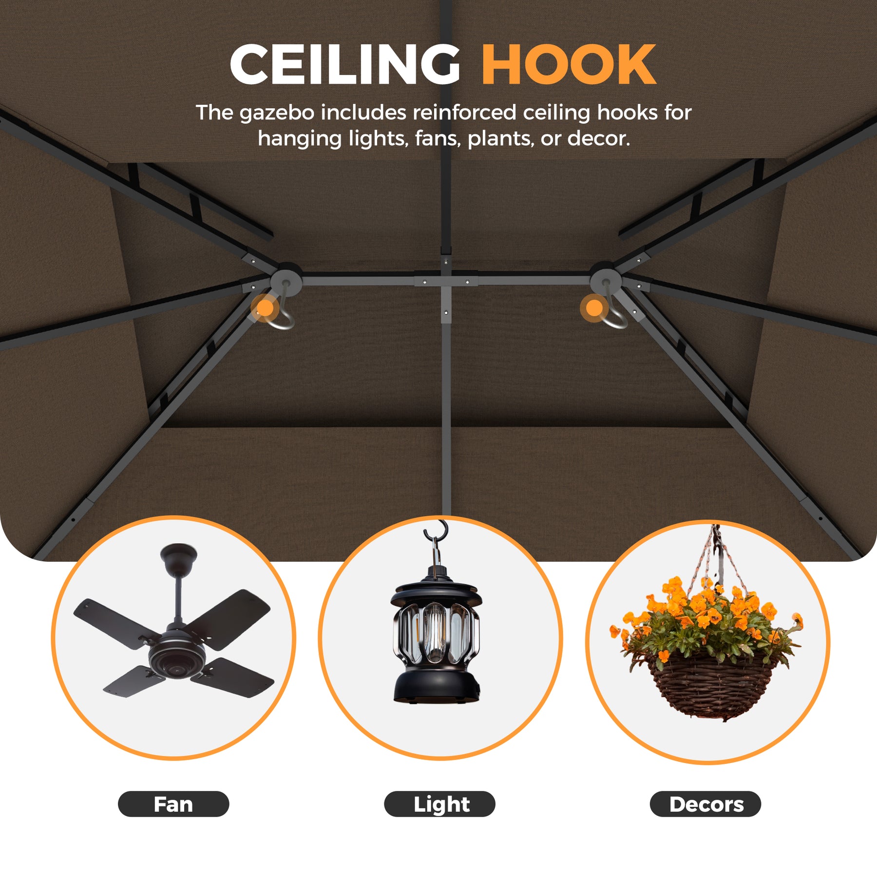 Spacious 10' x 12' Entertainment Area Offering 120 square feet of coverage, this generously sized gazebo can comfortably host many guests and accommodate outdoor furniture. It's perfect for gatherings, dining, or simply creating a cozy retreat in your garden or patio.